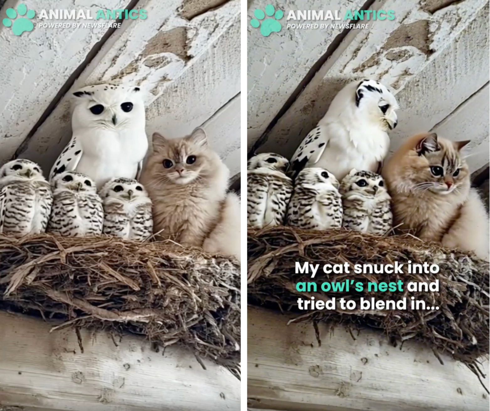 This video of a cat curling up in an owl’s nest was distributed by the video licensing agency Newsflare before being flagged as AI-generated. It currently has almost nine million views on Facebook. However, it was later withdrawn from their video licensing platform, as reported by trade publication The Press Gazette.