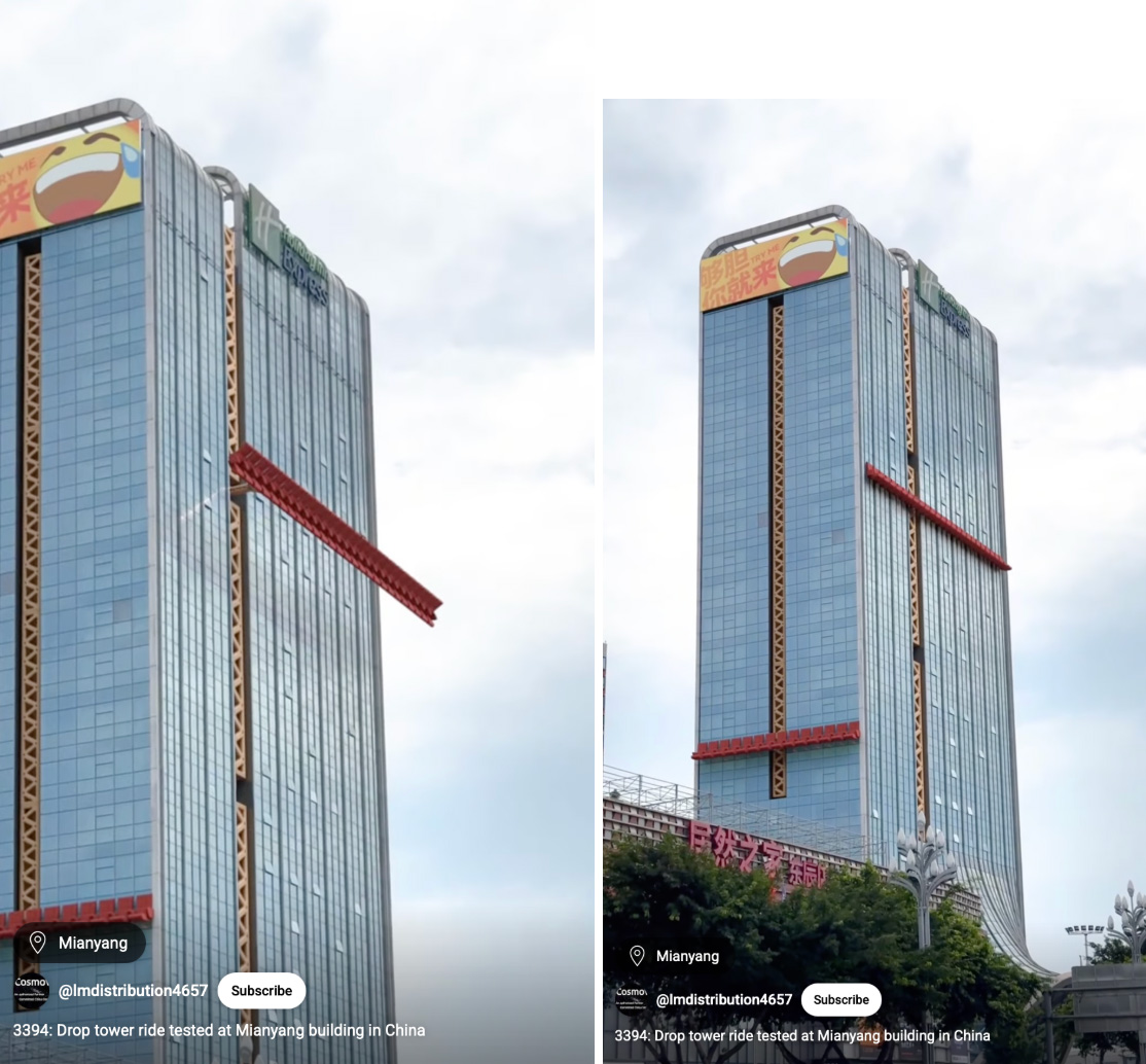 This fairground ride whizzing up the side of a Holiday Inn Express hotel might look exhilarating but guests would no doubt be pretty unhappy with it disturbing them throughout the day. Visual inconsistencies in the frames show that the mechanical arm is also floating and the ride is seemingly moving through the concrete and steel of the building.