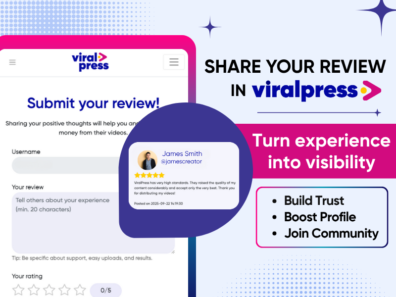 Your feedback matters. A testimonial not only strengthens trust in ViralPress but also helps boost your own profile, making it easier for clients to discover your work.