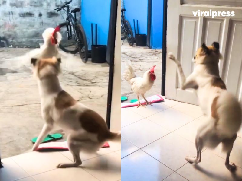 The footage shows Chooey using his body to nudge the chicken toward the front door. However, Sunkist was not intimidated. The hen stood her ground, pecking back and resisting every attempt to be moved. As Chooey tried to maintain a 'cool' image, his authority crumbled in the face of the stubborn bird. The standoff resulted in a stalemate until Sunkist finally decided to leave on her own terms, proving he was no match for the hen.