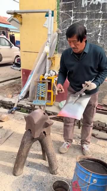 Bladesmith couple forge steel shovel creating rhythmic sounds