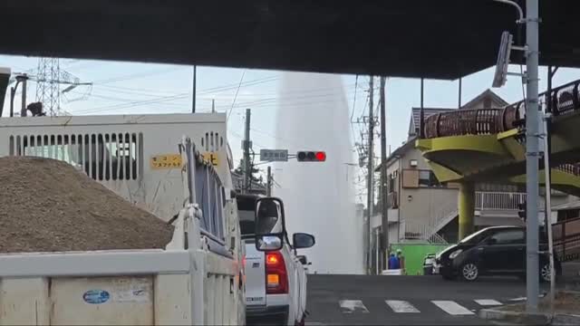 Water pipe bursts spraying fountain across road in Japan
