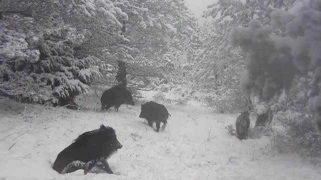 Wild boars frolic on snowy slopes in Croatian National Park