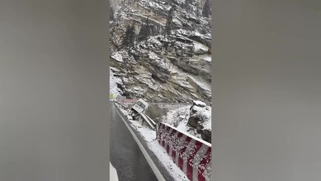Van hangs over cliff after smashing through guardrail on snowy mountain road