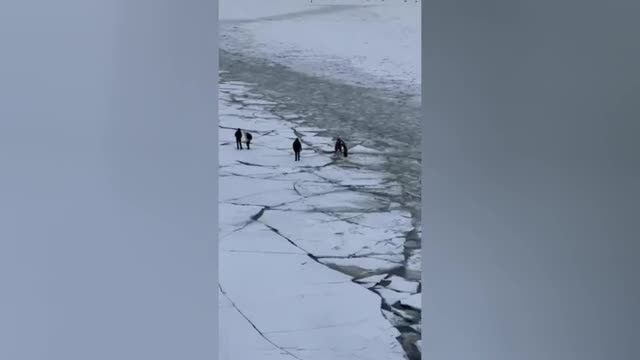 Mother slammed as she takes young son onto broken ice on river despite ban