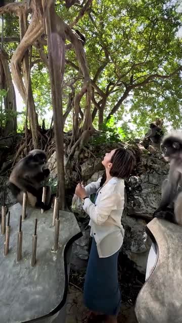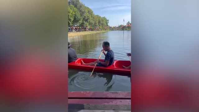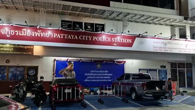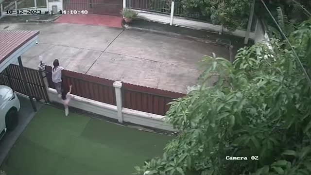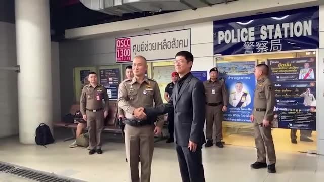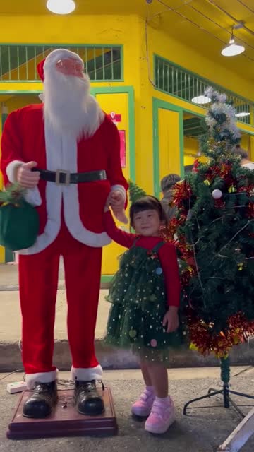 Footage shows four-year-old Opal wearing a red long-sleeved shirt and a Christmas tree-inspired dress while holding hands with the animated Father Christmas figure in Banthat Thong, Bangkok.