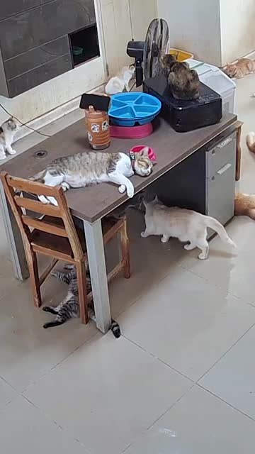 Footage shows the 15 moggies showing up in the kitchen and climbing up the table as the youngster was eating his meal in Bangkok, Thailand, on January 14. 2026-02-04 22:02:54