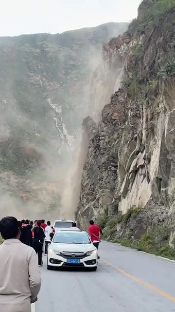 Footage shows travelers standing outside their cars, watching rocks roll down the hill along the G215 National Highway between Shangri-La and Daocheng Yading in Yunnan, China. 2025-11-26 22:27:02