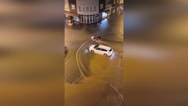 Footage shows a roadway completely submerged as a white car made its way through the water alongside a motorbike in Campanha, Minas Gerais. 2025-11-19 17:54:58
