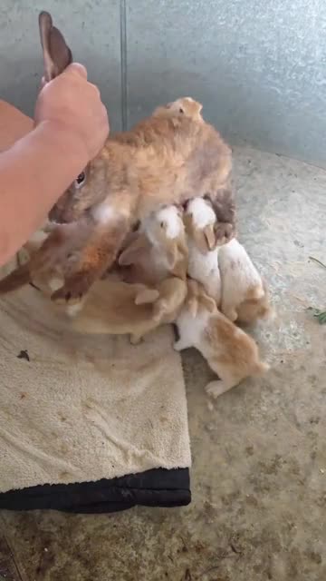 Footage shows ten hungry kits hopping chaotically in their enclosure, with the brown doe being carefully lifted by the ears by the keeper to keep her steady in Hunan, China. 2025-12-01 13:52:49