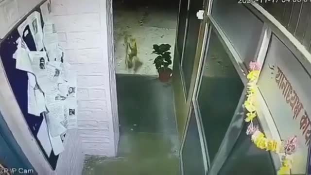 CCTV footage shows the ravenous wild cat running inside the building before lunging at the black canine outside the Betalghat Police Station in Uttarakhand, India. 2025-11-26 17:19:22