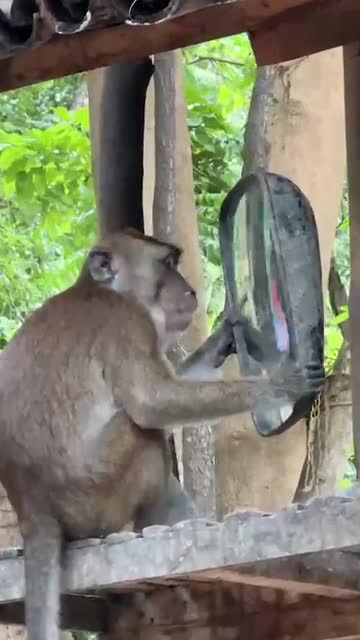 Footage captured by Allysa Philar Delos Reyes shows the primate sitting on a wooden plank, intently looking at itself in the hanging mirror in Cebu, the Philippines. 2025-11-28 14:27:16