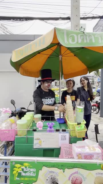 Footage shows the dessert vendor wearing a black stovepipe hat, his face painted white, with a red nose and thick black eyebrows, in Bangkok, Thailand. 2025-11-28 14:26:07