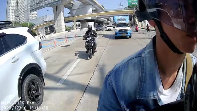 Helmet-mounted camera footage shows the traveller, wearing a denim jacket, falling from the moving two-wheeler while navigating a highway in Nonthaburi, Thailand. 2025-12-26 15:20:05