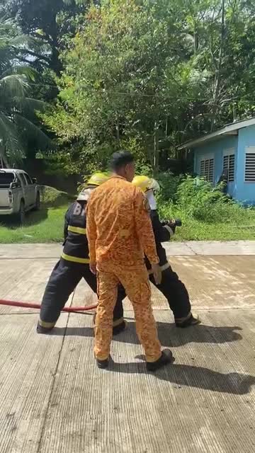 Leslie Salud and her classmate, both dressed in heavy personal protective equipment, were performing a fire simulation as part of their work immersion program in Davao, the Philippines. 2025-12-22 21:07:41