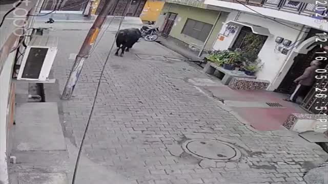 CCTV footage shows the animal standing outside a residential area as the man attempts to scare it, even throwing an object in Uttar Pradesh. 2025-12-22 18:17:51
