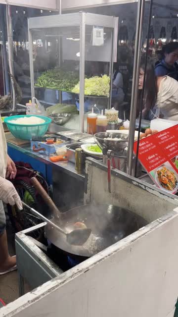 Footage shows the cook preparing Kuay Teow Kua Gai, a traditional Thai stir-fried noodle dish, at a bustling night market in Bangkok, Thailand. 2026-02-04 21:59:18