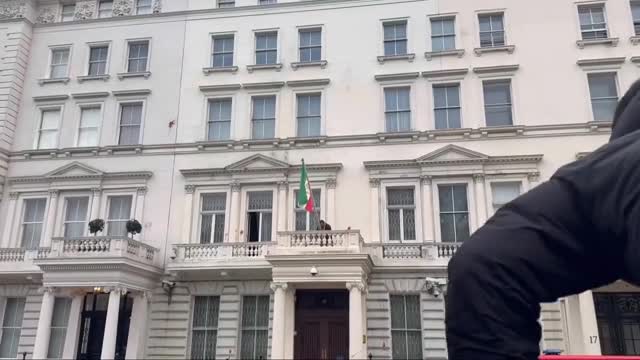 Crowds gathered outside the building in Kensington during a demonstration against the regime. Footage shows how one man scaled the building to tear down a flag. 2026-01-11 00:59:14