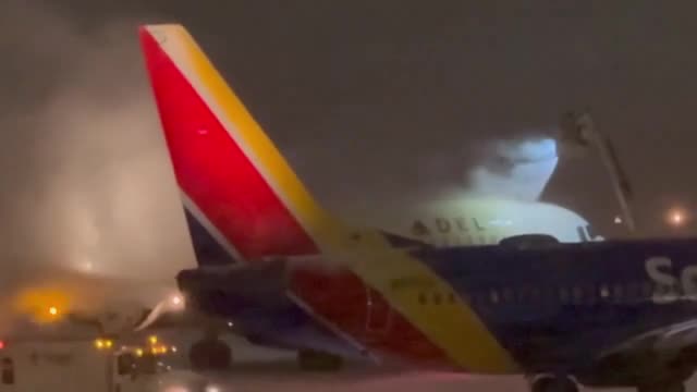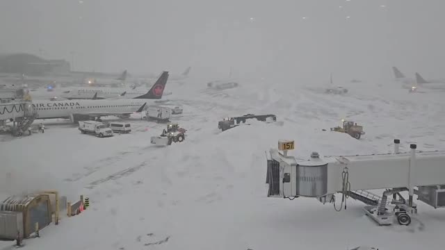 Footage shows snow-ploughing machines sweeping through fresh powder at Toronto Pearson International Airport on January 15, with parked aircraft barely visible in the background.