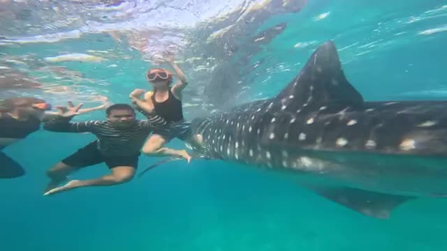 Footage shows snorkeller Eden Tajan and her husband swimming upwards to avoid the animal as it passes closely by in Cebu, the Philippines. 2026-02-13 14:23:23