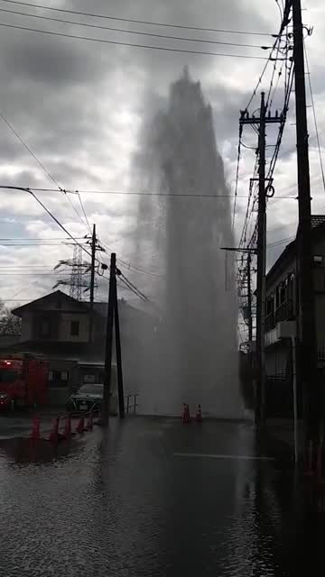 Footage shows a powerful jet of water blasting around 32 ft into the air, sending a misty spray across nearby streets in Kawaguchi City. 2026-02-13 17:36:45
