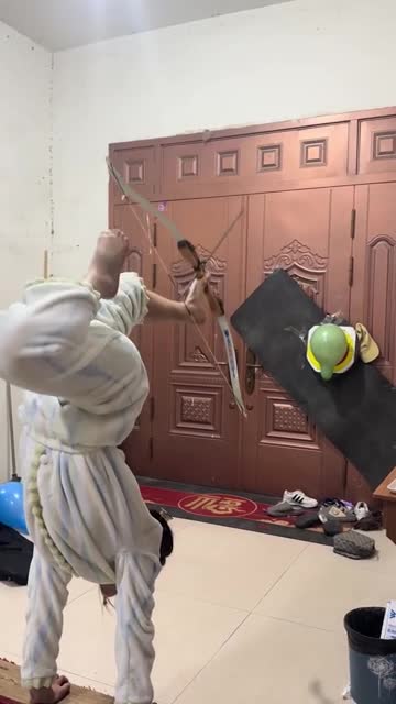 Footage shows the performer in a steady handstand, using her toes to grip a bow and arrow during an extraordinary archery routine at her home in Fuyang, China. 2026-03-05 13:21:01