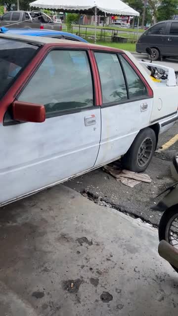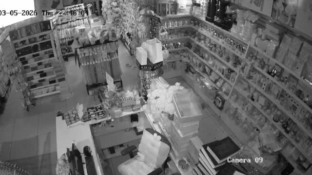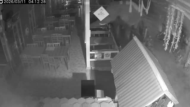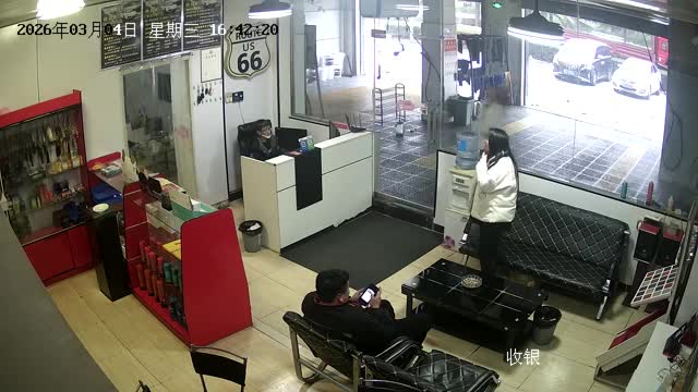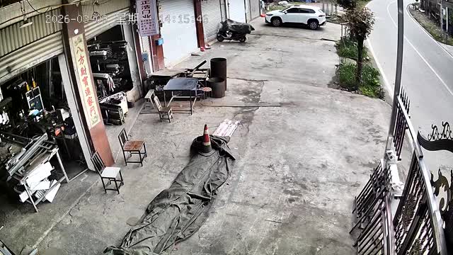 CCTV footage shows the speeding pickup truck hitting a parked white hatchback and a black motorcycle before toppling over in front of the store in Sichuan, China. 2026-03-11 14:32:05