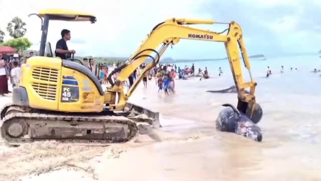 The 21 whales did not survive when a pod of more than 50 became stranded in shallow waters near Mbadokai Beach in East Nusa Tenggara on March 9. 2026-03-12 12:56:26