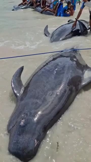 Families and children came to watch the 21 creatures that did not survive when a pod of more than 50 became stranded in shallow waters near Mbadokai Beach in East Nusa Tenggara. 2026-03-12 12:55:47