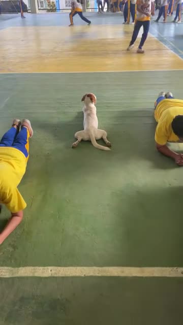 Cheeky stray dog joins students planking in PE class