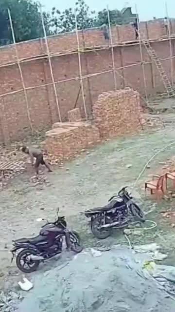 The elderly woman, holding a stone, attempted to shoo the macaque away from a parked scooter in a residential area of Delhi, India. 2026-04-02 21:28:27