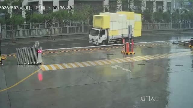 CCTV footage shows the white cargo lorry navigating a turn from the road into a parking area as strong gusts of wind battered Guangdong, China. 2026-04-07 21:45:16