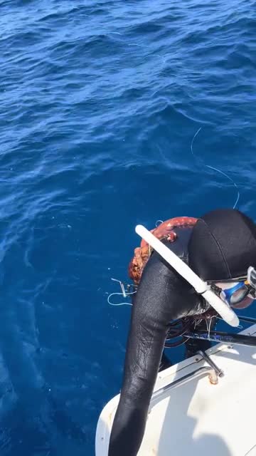 Footage shows the man in a full black rash guard climbing back into a boat with the eight-limbed mollusc wrapped around his body off the coast of Hainan, China. 2026-04-07 21:39:40