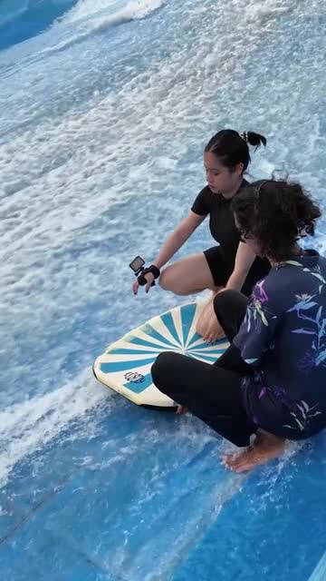 Inspiring footage shows a surf coach teaching Sirinda Phiewkliang how to balance on her stomach on a board at the Flow House attraction in Bangkok, Thailand. 2026-04-14 18:53:15