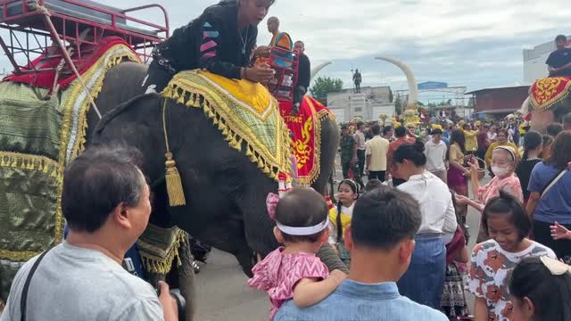 A couple of golden intricate candle wax sculptures were displayed on the road in preparation for the Buddhist festival parade in Ubon Ratchathani, Thailand, on July 23.