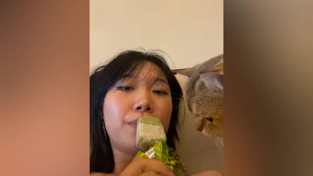 Ms Zou was eating the cold sweets when its hungry British Shorthair pet decided to have a taste of it in Yantian, Shanzhen, Guangdong, China, on July 5. 2024-07-23 21:09:02
