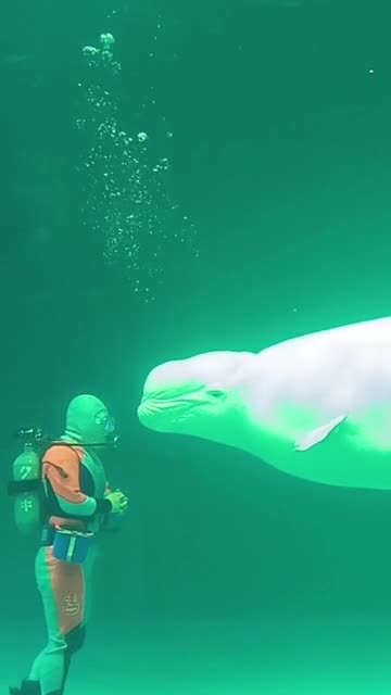 Footage shows the marine mammal facing the tank diver and made rapid up and down motions with its head at Kamokawa Sea World in Chiba. 2024-07-23 21:16:42