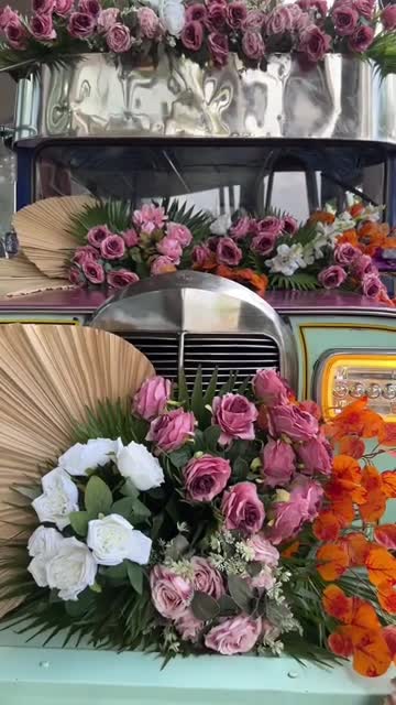 Zharie Mae and Kyle Michelson Maglaqui tied the knot with the unconventional bridal car featuring a traditional jeepney adorned with flowers and palm tree fans in Manila, the Philippines, on July 13.