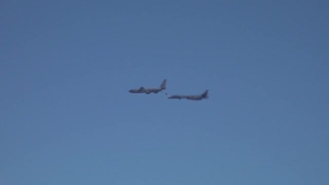 Footage shows the B-1B Lancer from Texas' Dyess Air Base 7th Bomb Wing flying under a KC-135 Stratotanker from Florida's 927th Air Refueling Wing on July 18. 2024-07-22 12:14:29