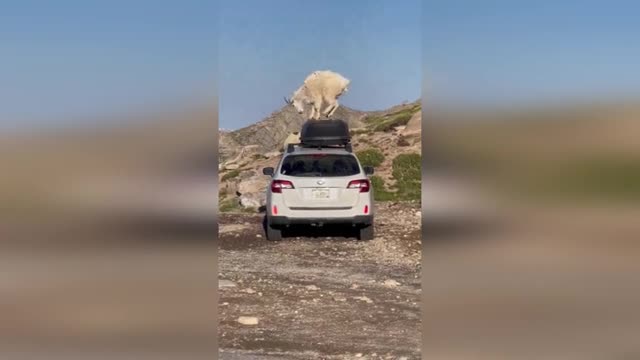 Footage shows the two hoofed animals hopping all over the Subaru Outback and tapping on the roof box while it was parked on a dirt road in a trail in Mt Blue Sky in the Rocky Mountains on July 15.