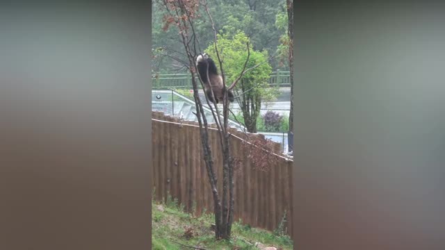 This is themoment an acrobatic panda bit off more than she could chew after hanging from a treebranch by her mouth and then plunging several metres to the ground. 2024-07-13 10:01:52