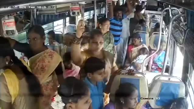 The woman, Saradha, 52, was standing inside the crowded bus but failed to see the uncovered steps and the open door - walking straight into the gap.