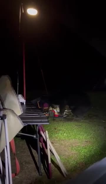 Asian black bear rummages through campsite for food