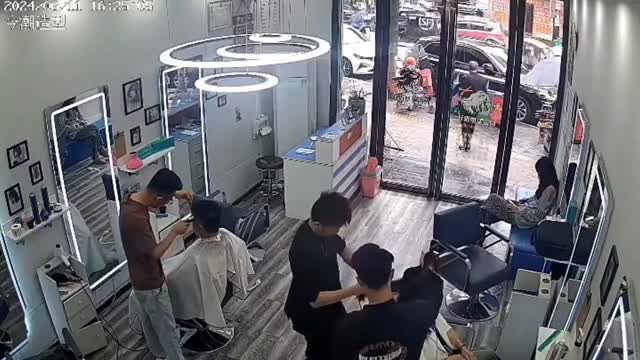 The hairstylist was drying his client's hair when the machine experienced a short circuit, causing a brief panic among those inside the establishment in Guizhou, China, on June 11.
