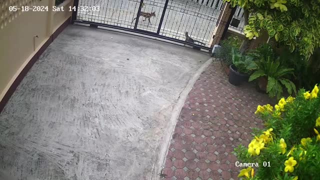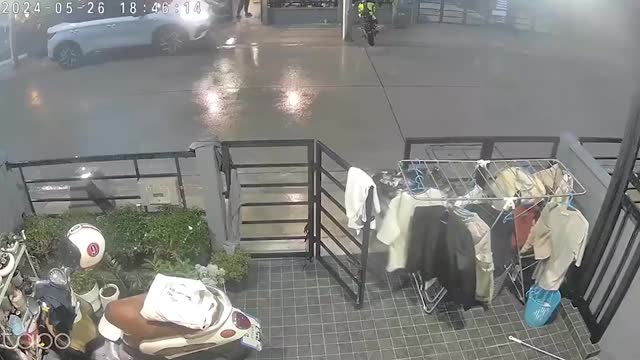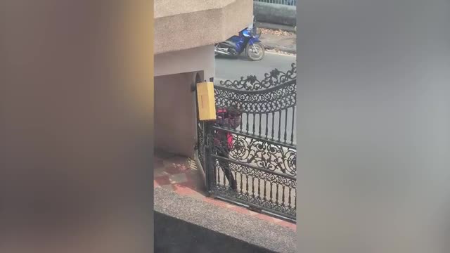 The 6ft-long reptile panicked when it saw a dog along the street and squeezed through the gaps of the metal bars of a gate in Chonburi province, Thailand, on May 10. 2024-06-13 13:53:10