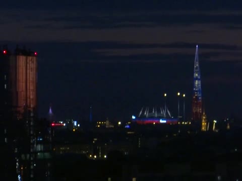 Footage shows the 87-story Lakhta Tower in Saint Petersburg standing 1,516 ft high alongside the Gazprom Arena stadium illuminated in red, white and blue. 2024-06-13 12:02:28