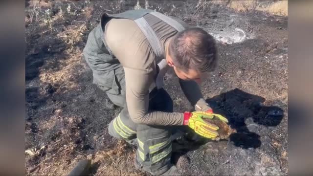 Footage shows officers Okopny Daniil and Vitaliy Bazhura from the 20th Fire and Rescue Unit picking up and checking on the injured animal from the scorched ground. 2024-06-10 14:11:27