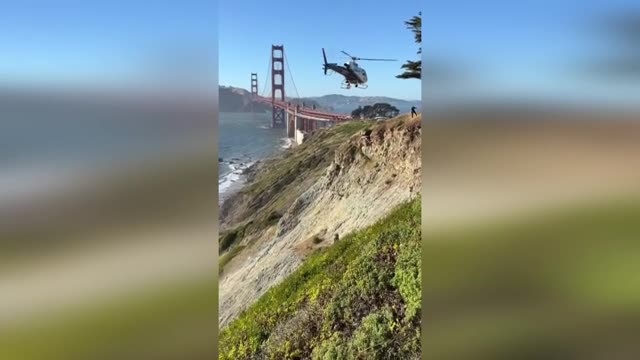 Footage shows an aerial unit from the California Highway Patrol (CHP) - Golden Gate Division Air Operations (H30) flying over the steep terrain in San Francisco, California. 2024-06-07 12:55:34