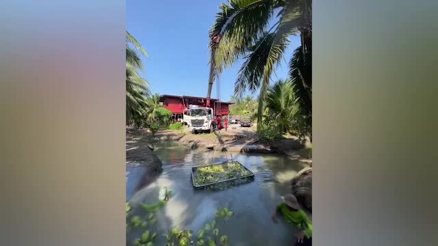 Footage shows the farmers wading in chest-deep irrigation between the trees where the fruit had been floating in Ratchaburi province, Thailand. 2024-06-02 16:48:48