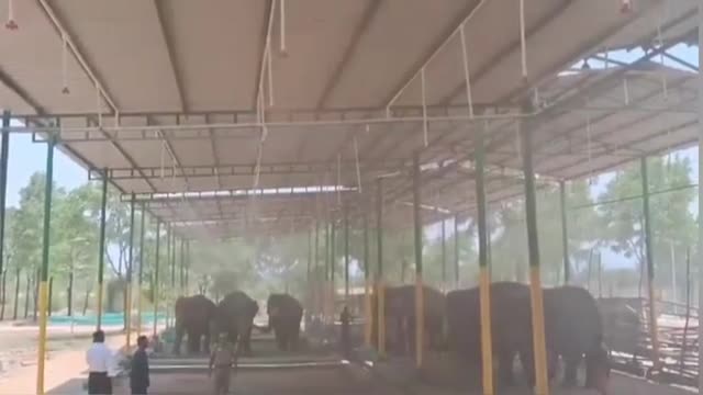 Footage shows overhead foggers dousing the elephants at the Trichy Elephant Rehabilitation Center in the southern state of Tamil Nadu. 2024-05-31 19:06:48
